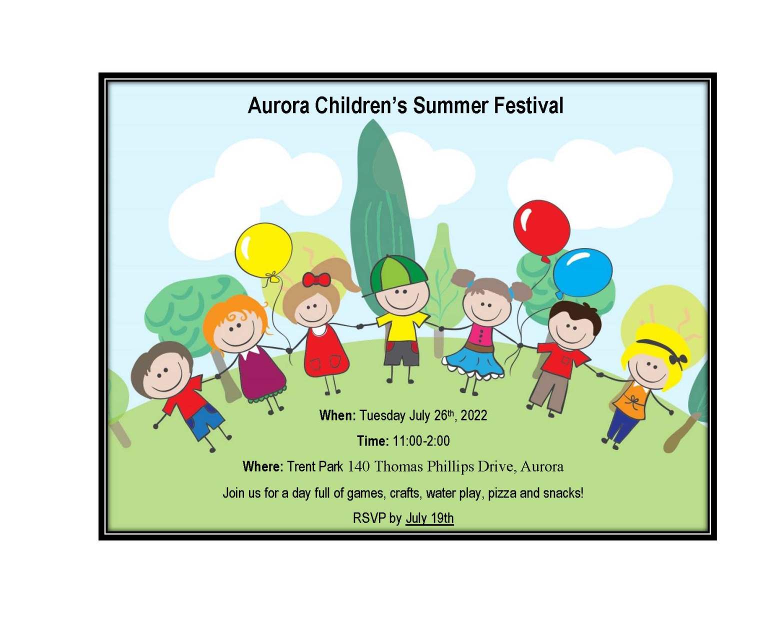 Join us for a day full of games, crafts, water play, pizza and snacks! When: Tuesday July 26th, 2022Time: 11:00-2:00Where: Trent Park, 140 Thomas Phillips Drive, AuroraRSVP by July 19th